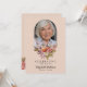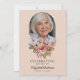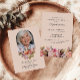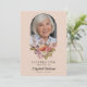 Denna vackra blommiga firande av liv eller begravning eller minnesstund inbjudan kort (tillgänglig som en direkt nedladdningsbar evite eller tryckta kort) hedrar vackert minnet av en nära och kära, och blandar elegans med en touch av värme och personlig anpassning. Framsidan har en mjuk rosa bakgrund, med ett foto av din nära och kära inramad i en delikat båge högst upp. Nedanför fotot, en fantastisk arrangemang av blommor och grönska i pastellrosa, orange och vitt, inklusive rosor och peonior, lägger till en mjuk, tröstande touch, som perfekt kompletterar det lugna temat. Orden "Firar livet av" är elegant skrivna, följt av din nära och kära namn och födelsedatum och dödsdatum, vilket skapar en hjärtlig hyllning som är både tidlös och graciös. Baksidan av kortet inbjuder vänner och familj att samlas till minne, med detaljer om ceremonin snyggt organiserade i klassiska teckensnitt. Den mjuka rosa bakgrunden fortsätter med fler vackra blommiga element längst ner, vilket bibehåller kortets sammanhängande och lugna estetik. Denna sektion innehåller också utrymme för eventuella särskilda