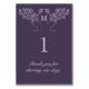 Ett modernt kort för bordsnummer i bröllop med en illustration i livets träd som består av två grenar i träd. Lavender löv på mörkens lila med ett monogram.