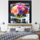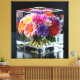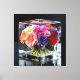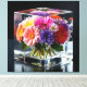 Färgglada blommor inklusive tusenskönor och nejlikor konserverade i en klar kub, vilket skapar en fängslande uppvisning av skönhet, kreativitet och konstnärskap mot en svart bakgrund.