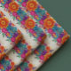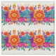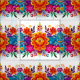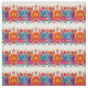 Detta tygmönster har horisontella band av livfulla, stiliserade blommor och lövverk mot en ljus bakgrund. Varje band är en spegelbild, som visar upp en livlig samling blomsterdesigner i ljust orange, blå, lila och rosa nyanser. Mindre accentblommor och blad i olika gröna och gula nyanser fyller ut luckorna och skapar en tät och festlig blomsterbård. Det övergripande intrycket är en glad och färgrik fiesta eller ett folkligt konstinspirerat formspråk.