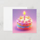 En livfullt dekorerad födelsedagstårta med ett enda ljus på toppen, omgiven av ljusa pastellfärger och konstnärliga frostingsdetaljer. Tårtan förmedlar en glad atmosfär och firande koncept.