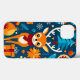 Livlig och färgrik helgtematisk mönster. I mitten finns en glad tecknad ren som bär en röd halsduk, omgiven av diverse festliga element. Dessa inkluderar julgransprydnader, julgranar, presenter, snöflingor och livfulla former. Bakgrunden är en rik blå färg som framhäver de ljusa orange, röda, gula och gröna färgerna hos dekorationerna. Lekfulla detaljer, såsom stjärnor och andra fantasifulla figurer, bidrar till en glad och festlig stämning, vilket gör den perfekt för en högtidlig firande eller säsongsbetonad dekoration.