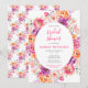 Den här söta och fantasifulla bröllopsinbjudan i akvarellstil har livfulla blommor i rosa, rött, orange och lila med grönska. Texten kombinerar handskriven skrift och sans serif-teckensnitt för en stilren och modern look. Detta är perfekt för en vår- eller sommarbröllopsdusch.