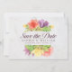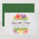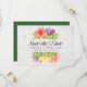 Denna eleganta blommiga "spara datumet"-kort har livfulla blommor med orden "spara datumet" i trendig handskrift, allt mot en ljus marmorerad bakgrund på framsidan och en grön baksida.