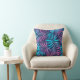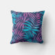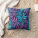Framsida och baksida av en kudde med ett livfullt bladsmönster. Blad i rosa och blå nyanser täcker en mörk bakgrund och skapar en tropisk känsla.