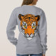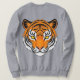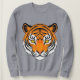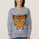 Ljus grafisk design av ett tigerhuvud i orange, svart och vitt med genomträngande gula ögon; perfekt för logotyper, sportvarumärken, maskotar eller kläder. Utlöser kraft, mod och vild energi som passar för djärva kampanjer.