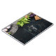 En bärbar dator för dina favoritrecept i familjen. Färsk mat, örter, basililjonioner, en trästyckningsdel en örthuggare på en målares mörk, rustik duk med färgfläckar. Anpassa och lägg till namn och text för din familj.