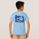 En silhouette av en surfare som gör ett trick av ett grafiskt, vinkar. Det finns ett följetryck på bekläda av t-skjortan. Denna design kommer i tre colorways.