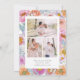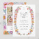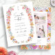 Ljus Blommig Spara Datum. Tillkännage din stora dag med ett djärvt och vackert Spara Datum som svämmar över av färg och personlighet. Ett monogram infattat i en elegant oval krans av skära, ljusa fuchsior, orange, och gyllene gula peonior, lavendelrosor, blå delphinium, glada tusenskönor och vilda blommor skapar en varm och glädjefylld välkomsthälsning till din vår-, sommar- eller fantasifulla höstfirande. En mjuk fjäril tillför en antydan om lekfull romantik, medan baksidan har en modern fotokollage och ett koordinerande blommigt mönster som gör din tillkännagivelse ännu mer minnesvärd. Låt din kärlekshistoria blomstra från början – skapa ett minne som är