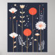 En samling färgglada blommor och cirklar stiger mot en marin bakgrund och visar en modern och konstnärlig representation av naturen med olika former och livfulla färger.