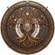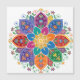 Symmetrisk cirkulär mandala med färgglada lotusblad och invecklad blomstermönster på vit bakgrund.