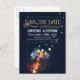 Speciellt och unikt spara vykortet med vacker vismisk mason burk med glansande ljus-fejrer. Modern men ändå vintage sparar perfekten för datum för teman för det radioaktiva landsbyggsbröllopet.