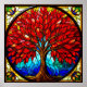 Ljus glasfärgskonst som illustrerar ett strålande rött träd prytt med intrikata detaljer. Ljus färger och detaljerad hantverkskonst inger värme och stillhet. Perfekt för konstelskare eller dekorativa tema-designs.