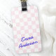 Loggtagg med ditt namn i blått, ett blått stil-teckensnitt över en blek rosa och vit schackbräde mönster.