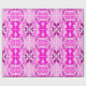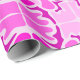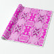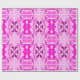 Rulle dekorativt presentpapper med ett livfullt rosa och lila abstrakt mönster, med symmetriska blommotiv och geometriska former på en ljus bakgrund.