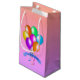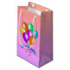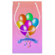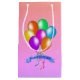 Den här presentsäcken är i söt ljusa färger av persika, rosa och lila med en samling festliga ballonger i vibrant färg med matchande hängströmmare och en blå banderoll som säger Grattis på födelsedagen.