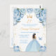 Denna eleganta och glamourösa födelsedagsinbjudan presenterar en vacker prinsessa med brunett hår i en ljusblå balklänning. Texten kombinerar handskriven skrift och moderna sans serif-teckensnitt för en klassisk och sofistikerad look. De blomsterarrangemangen, fjärilen och det gyllene konfettit skapar den perfekta blandningen av rustik och chic.