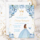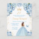 Denna eleganta och glamourösa födelsedagsfestinbjudan har en vacker prinsessa med brunt hår i en ljusblå balklänning. Texten kombinerar handskriven skrift och moderna sans serif-teckensnitt för en klassisk och sofistikerad look. De blomsterarrangemang, fjäril och guldconfetti skapar den perfekta blandningen av rustik och chic.