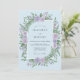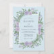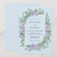 Denna design har en frodig akvarellarrangemang av lavendelrosor och livfulla gröna ormbunkar mot en mjuk pudrig blå bakgrund. De botaniska elementen skapar en lugn och romantisk atmosfär, perfekt för en vårskogsbegivenhet. Färgpaletten kombinerar svala pasteller med rika bladgröna för en graciös estetik.