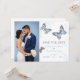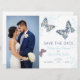 Söt ljusblå och mörk blått inbjudningar till bröllop spara datum. Svettsvans, målad dam och fåtöljer bröllop spara datum. Perfekt för fjäril eller ljusblå mörk blått och korallblåst bröllop som drivs av färg. Anpassa med din egen namn och datum till sparan. Andra matchande artiklar är också tillgängliga. © Original Innesluten fjäril Art och design av Sarah Trett för www.mylittleedenweddings.com