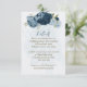 Vacker romantisk bröllopsmottagning detaljer inneslutande kort med marinblå och ljust dammig blå blommor och några vackra blad .
