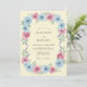 Denna design har en mjuk akvarellpalett med ljusblå och rosa rosor som är vackert arrangerade på en krämig gul bakgrund. Ömtåliga kvistar av lila lavendel och salvia grön bladverk tillför en touch av naturinspirerad elegans. Den måleriska stilen skapar en romantisk och luftig atmosfär perfekt för ett säsongsbundet vårbröllop.