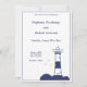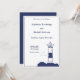 Elegant och enkel bröllopsinbjudan med en illustration av en fyr i marinblå toner för ett marint och nautiskt tema bröllop!