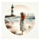 En graciös ung kvinna i en flytande vit klänning vandrar längs sandstranden, hennes sol-hatt lutade mot bron när hon blickar mot en strimlad fyr som stod stark mot vågarna. Äggräs ram ligger i förgrunden medan sjöfåglar och segelbåtar flyter över horisonten, vilket ger kustlandskapet en känsla av lugn. Den mjuka vattenfärgen stil blandar romantik och lugnet och skapar en tidlös kottagecore-inspirerad havsbottenscen som känner sig både nostalgisk och drömmande. AI skapade teckningar.