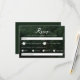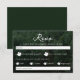Ett rustikt RSVP-kort med en naturskön skogsfoto i bakgrunden av Destei med elegant titeltext som lyder “RSVP” och en underrubrik som inbjuder gästerna att vänligen svara senast det angivna datumet. Utrymme finns för gästnamn, svarsalternativ och menyval med silhuetter av lönnlöv som unika kryssrutor för att komplettera skogstemat. En sektion för matpreferenser erbjuder utrymme för ytterligare information. Baksidan har en grön bakgrundsfärg med en silhuett av en ädelgran och personliga initialer och bröllopsdatum. Perfekt för utomhus-, skogs-, vandrings- eller naturinspirerade bröllop.