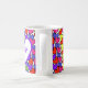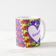 Ljusa, färgstarka hjärtan med en viss någons namn på ett kaffe mugg.