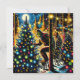 Personlig Bigfoot-julkort. Bigfoot som dekorerar Julgranar i skogen med prydnadsföremål och julgranar ljus. Måne lyfter genom träd. Lägg till lite saquatch humor till julen med de här tecknad bok stil-klistermärkena.