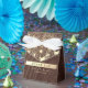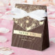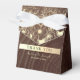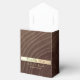 En elegant bröllagsfavor-box i rustik stil med en falsk trätektur, strängljus och gyllene blomsterdetaljer. Personligad med namn och datum, perfekt för förpackning av söta godsaker, små presenter eller tackkort till era gäster.
