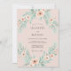 Denna design har en mjuk ljusrosa bakgrund prydd med ömtåliga persikorösa rosor och frodig grönska. De botaniska elementen inkluderar salvia gröna eukalyptusblad och ormbunksliknande bladverk, vilket skapar en romantisk och luftig atmosfär. Perfekt för ett säsongsbetonat vårtema, frammanar konstverket en känsla av naturlig elegans och stillhet.