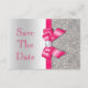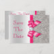 Personliga bröllopsinbjudningar "Save The Date"-kort. Eleganta anpassade silver- och roliga varma rosa färger dubbelsidiga platta "save the date"-kort med ett vackert glänsande tryckt glitter-sekvensmönster, söta blanka tryckta vektorsnören och band och vackra, stilrena tryckta bilddiamanter glitterjuveler och groovy varmröd text på en silverfärgad gradientbakgrund. Dessa klassiska, glamourösa, moderna varmröda och silverfärgade formella anteckningskort är dekorerade på båda sidor och tryckta på ditt val av inbjudanpapper. Vackra, chic, trendiga, moderna dubbelsidiga kort med kvinnlig glitter och glamour. Observera: Alla inbjudningar på Zazzle har platta tryckta bilder. Jag har matchande produkter för bröllop i min butik. Text, teckensnitt och färger på t