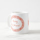 En chic julkaffe Mugg som ska anpassas med en julkrans av holly, ivy, poinsettias, fir cones och sprit av fir träd. Den handdragna julandeperioden finns i ljusrött på en vit bakgrund som du kan ändra om du vill, med "God jul också i Röd, som du också kan ändra.