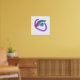 Ljusa, roterande former i lila, rosa, grönt och blått skapar en lekfull abstrakt design på en vit bakgrund. En tunn röd linje löper genom mitten och lägger till kontrast och djup.