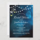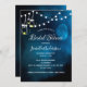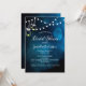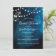Ett romantiskt inbjudan-kort för en rustik möhippa. En mörk blått kväll och natt med fullt måne och sträng ljus. Två lackade mason burk med ljus. Mallar för datum, namn, händelsemängd och OSA. Namn är skrivet med ett modernt handskript i stil. Vit brev.