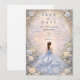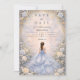 Denna eleganta quinceañera-design har en mjuk pudrig blå akvarellbakgrund omgiven av ömtåliga elfenbensrosor, subtilt grönska och utsmyckad guldbeslag, med en graciös klänningillustration som skapar en förfinad, sagoinspirerad atmosfär. Den svala blå färgpaletten i kombination med romantiska blommor ger designen en tidlös, lyxig känsla, perfekt för en klassisk quinceañera-firande med en elegant trädgårdsestetik.