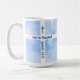 I mugg finns ett kor med ett meddelande och en bibelverse tillsammans med ett foto av himlar. Meddelande och Bible-vers är anpassade.