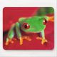 Fotografera av ett ljust - den gröna grodan med röda ögon och orange fot mot en röd bakgrund.