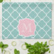Ett vit skisserat quatrefoilmönster är på ett ljust, havet skummar nästan grön bakgrund. Centrera har en anpassade tänder, pudrar den rosa monogramramen som ge en komplimang den gröna färgen prettily.