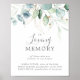 Denna ljust gröna i kärleksfull minnes- bröllopsskylt är perfekt för ett modernt bröllop. Den eleganta botaniska designen har ljust och luftigt akvarell-eukalyptus accentuerat med lekfulla gyllene glitterblad.