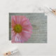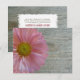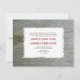 Ett roligt och livfullt bröllopsinbjudan med ett foto av en ljuslila tusensköna som tittar fram från vänster sida över en bakgrund av brädgård. Den motsatta sidan har en bakgrund av brädgård med text i mitten inuti en vit rektangel med en ram i varmröd som matchar tusenskönan. Personalisera med detaljer om ditt evenemang. Texten är från brudens föräldrar.