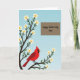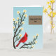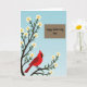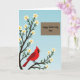 Kortet är designat med en mjuk vårscen och visar ett kraftigt träd med mörka grenar som sträcker sig upp längs vänster sida, prydda med små vita blommor med gula centra 🌼. Mot en mjuk blå himmel som tonar från djupare till ljusare nyanser vilar en klarröd fågel med svart ansiktsmarkering och orange näbb på en lägre gren, placerad som om den pausar för att vaka över någon med tyst omsorg ❤️. Blommorna samlas runt fågeln, vilket ger ögonblicket en öm och kamratlig känsla, som en lugn paus som delas mellan nära och kära. I det övre högra området skapar en snygg brun rektangel ett tydligt utrymme för meddelandet utan att tränga undan konstverket. Texten lyder “Happy Mother’s Day Omi”, skriven med jämna, flytande bokstäver i en ljus färg som sticker ut mot den bruna panelen. Layouten håller trädet och fågeln som huvudpunkten medan meddelandet sitter bekvämt åt sidan. Fågelns karmosinröda fjädr