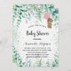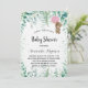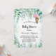 För en babydusch, fira en flicka. En söt liten nalle med rosa ballong, eukalyptus grey och grönt gnistor. Anpassa och lägga till uppgifter om namn i mamma till namn och party. Namn och texten: Baby Shower är skrivet med ett handskript i stil