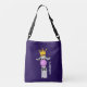 Bag med ett vismiskt lama som blåser en stor rosa bubbla. Med guld krona och svart fluga. Mörkens lila - bakgrund. Anpassa med namn.