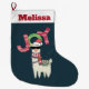 Julstrumpa personlig med namn. En liten illustration. En söt lama med svarta solglasögon, en röd tomhatt och en feg vinterscarf. Även med en sydamerikansk formad filt och pom-poms. Ord Joy skrev över huvudet i ett festivt färgstarkt teckensnitt. Ange på en mörk blått bakgrund.