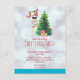 Vykort för julfestinbjudan med en lustig illustration. En söt lama med svarta solglasögon och en röd tomhatt. Stå bakom en Julgran med festligt presenter. Ord Joy skrev över huvudet i ett färgstarkt helgdag. Bältesbakgrund i silver med isigen blå gräns. Könsdesign och roligt jultema.