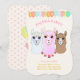 Llamadräkt fest inbjudningskort. Färgglada ballonger och tre söta lamor på ljusbeige bakgrund. Rosa stjärnmönster och ballonger på baksidan. Texten är redo att anpassas.