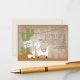 Bröstkort för babydusch med illustration framför baby och mamma lama i öknen bredvid en cactus. Dikt på motstående sida.